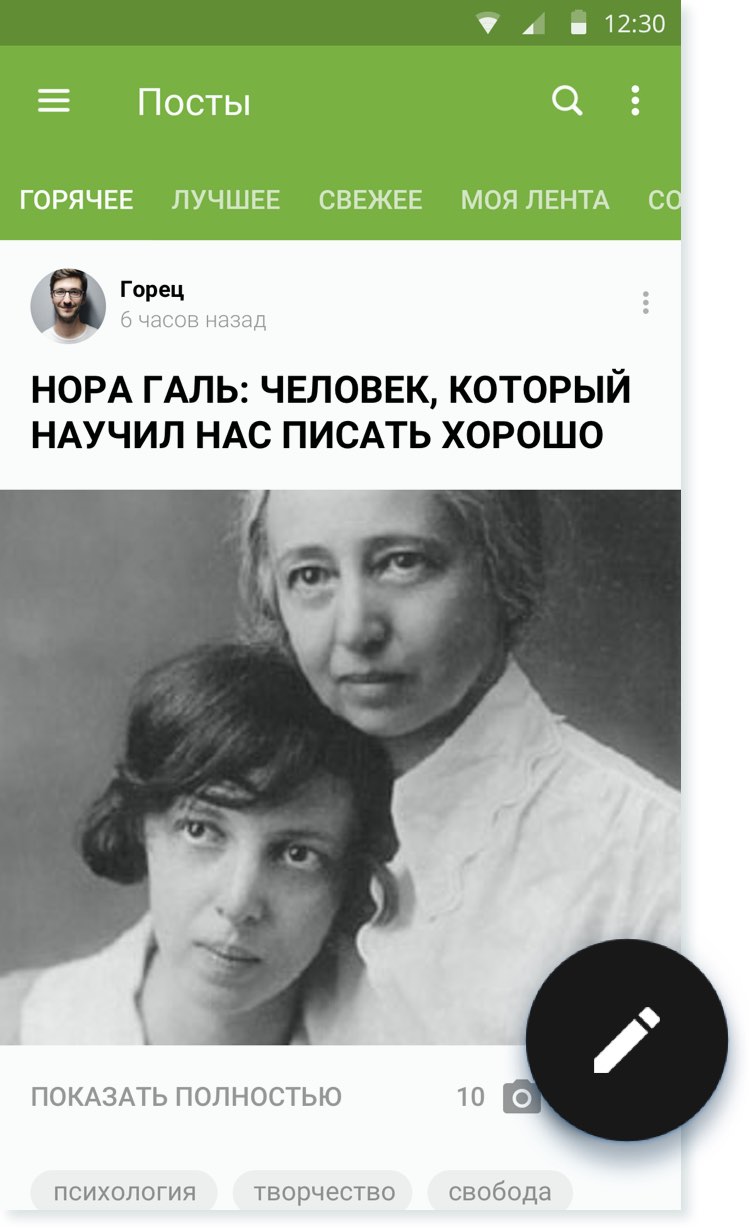 Floating Action Button (или FAB) — это самая важная кнопка приложения. Google рекомендует посвятить её основной ценности. Для пользователей Пикабу это создание контента, за которым приходят уже следующие пользователи. Больше контента — больше причин возвращаться, то есть рост retention. Поэтому мы вытащили кнопку «Написать пост» из меню на главный экран.
