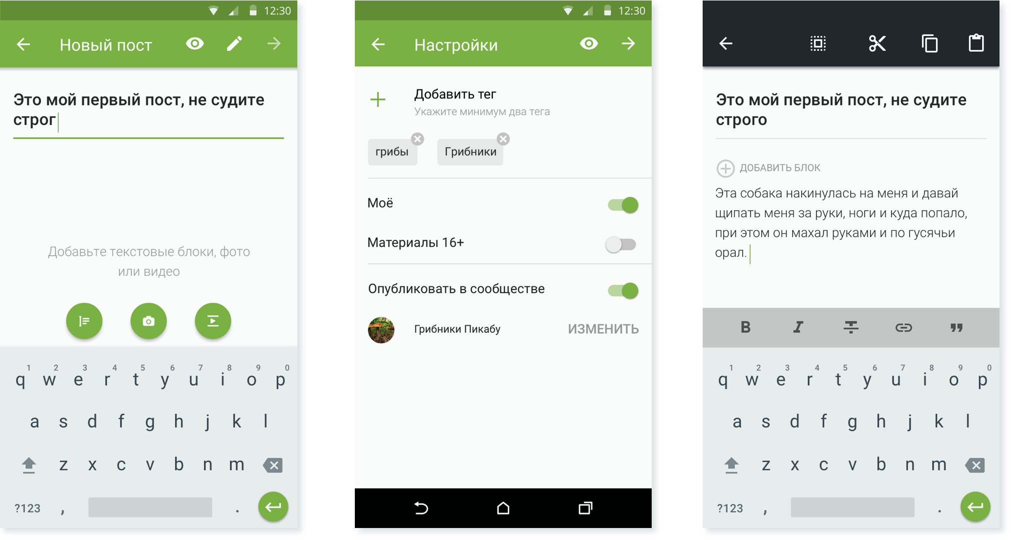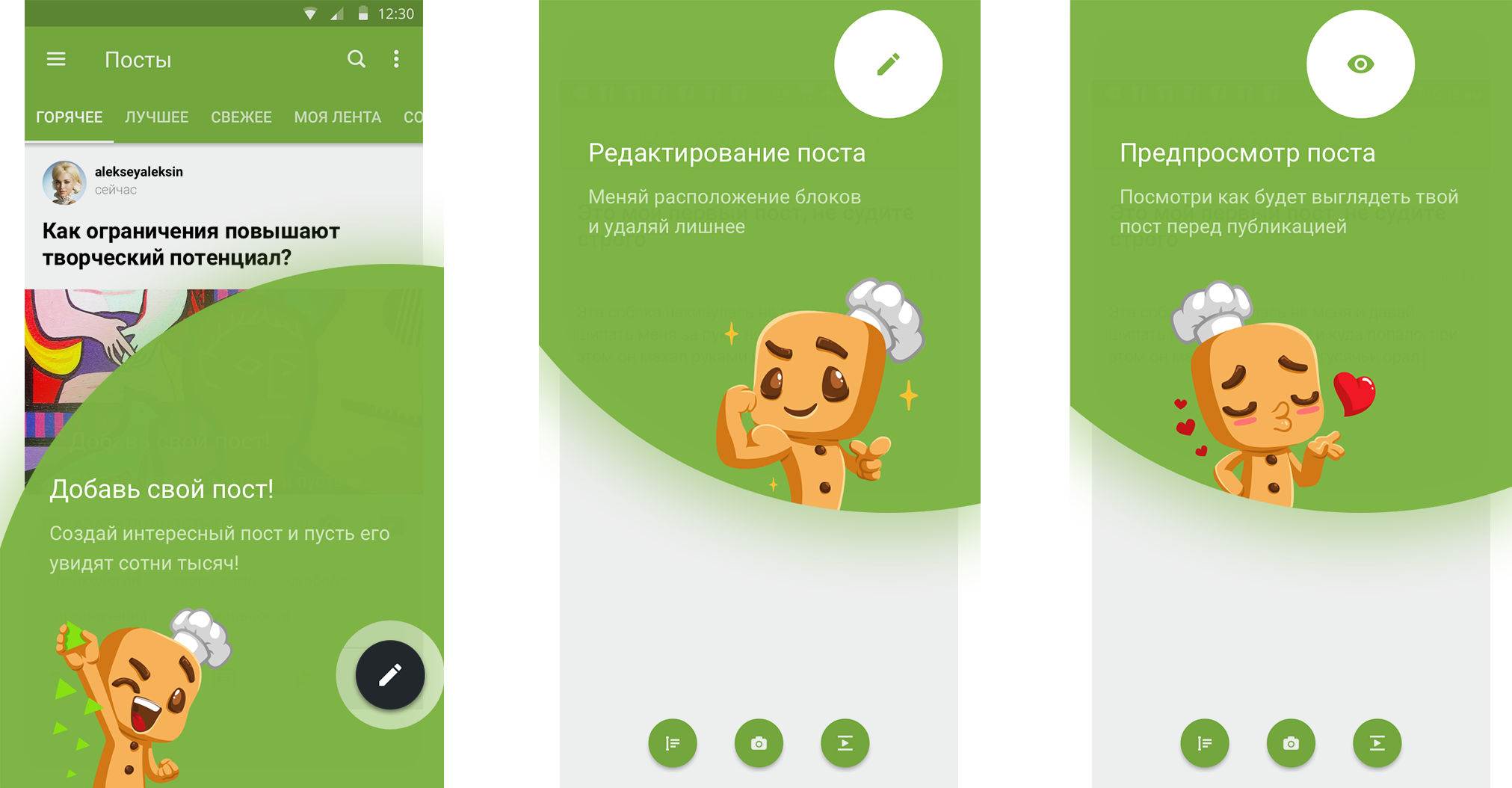 Продвижение возможности «Добавить пост» осуществлено с помощью карточки, помещенной между другими публикациями. Это станет мотиватором для читателей перейти в новую «касту» создателей публикаций.